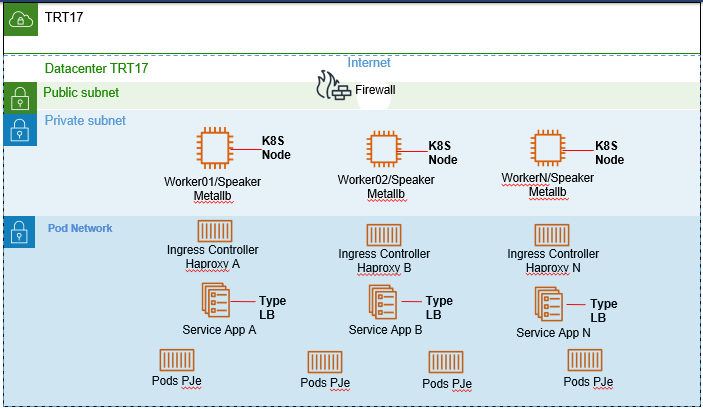 O diagrama , abaixo apresenta a arquitetura implementada utilizando Haproxy e Metallb do PJe On Premise:
