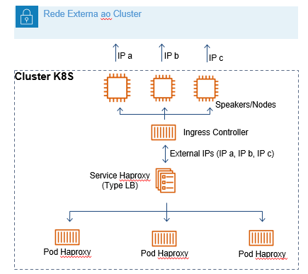 O endereço IP publicado pertence a um service no cluster Kubernetes, o qual é o load balancer para os pods do Haproxy. Este IP é o IP externo para o service. Também é importante mencionar o Ingress Controller do Haproxy. Ele é o elemento responsável por direcionar as requisições HTTP para o service do Haproxy.