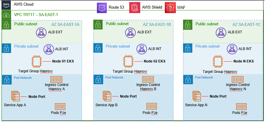 Para preservar o padrão de requisições do PJe e migrá-lo para a nuvem sem o uso do protocolo ARP através do Metallb, foi necessário repensar a interação da arquitetura com o ambiente externo ao cluster Kubernetes. Observando que, o cluster Kubernetes é o AWS EKS, a arquitetura proposta foi a seguinte: