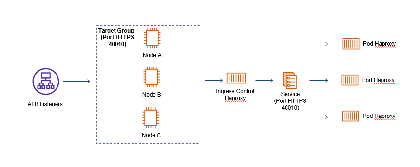 Nas regras de listeners dos ALBs estão configurados target groups que são compostos pelos nodes EKS, nos quais são executados os services do Haproxy. Sem o Metallb como Load Balancer, o service do Haproxy foi configurado com o type NodePort. Nessa configuração, cada node EKS que executa esse service apresenta a porta HTTPS configurada no NodePort. É através dessa porta que o ALB envia as requisições para o service do Haproxy e este as encaminha para os respectivos pods.