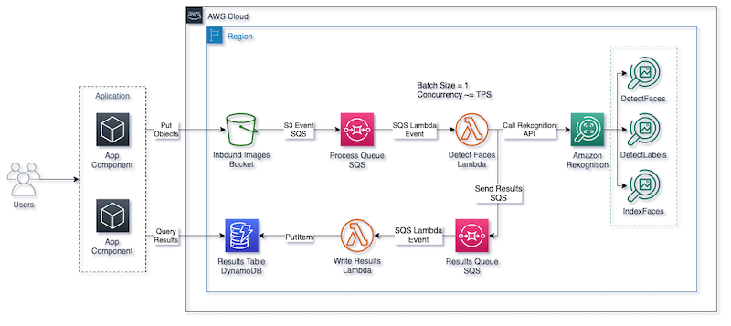 Essa solução aproveita os recursos do Amazon Rekogniton para processamento de imagens na escala de dezenas de milhares de eventos, incorporando serviços como Amazon SQS e AWS Lambda com recursos BatchSize e de simultaneidade reservada, gerenciando assim o fluxo de requisições para a API DetectFaces. Além disso, graças à implementação de Retry e Exponential Backoff + Jitter, é possível controlar os momentos de congestionamento e erros que podem ocorrer no uso da API.