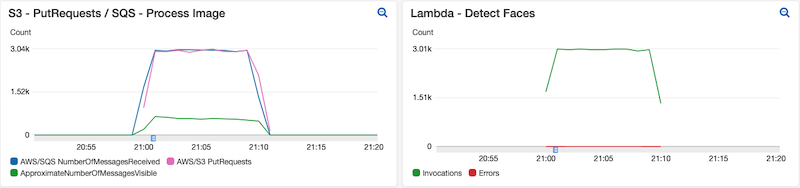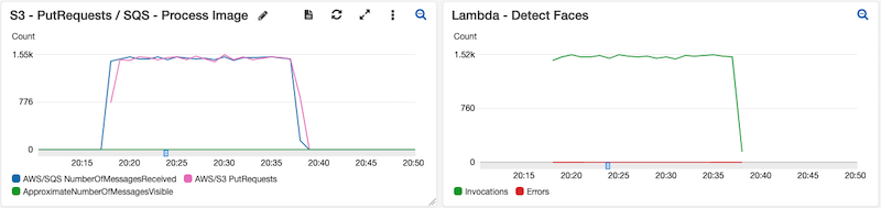 As 30.000 imagens foram processadas em 20 minutos. Conforme detalhado nas imagens 1 e 2, para cada evento PutObject no bucket de imagem S3, uma mensagem é gerada para o Process_Queue, pois a API é consumida em uma velocidade menor que a Cota de Serviço e Reservada Simultância das funções do Lambda. Cada mensagem que entra na fila é processada imediatamente, não aumentando o número de mensagens visíveis no Process_Queue. Além disso, há uma aproximação grande na quantidade de imagens recebidas e processadas pelo Amazon Rekognition.