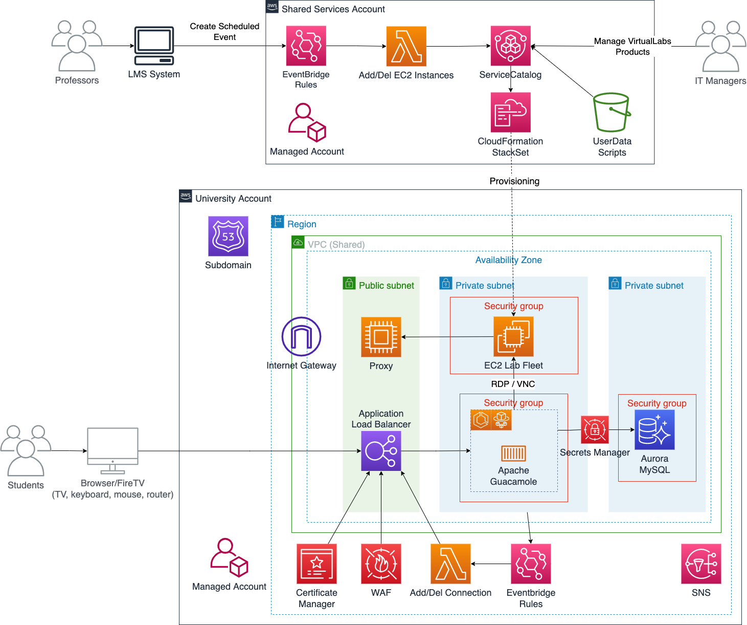 Dentro das contas de cada unidade da universidade existe uma VPC com três sub-redes. Uma sub-rede privada é para o banco de dados Amazon Aurora MySQL usado pelo Apache Guacamole, as credenciais de acesso são armazenadas no AWS Secrets Manager. Outra sub-rede privada é para aplicação Guacamole rodando em containers sem servidor usando Amazon Elastic Container Services (ECS) e o AWS Fargate. O Guacamole tem uma função de gateway que roteia o acesso dos navegadores clientes às instâncias spot dentro da sub-rede privada. O acesso público é exposto através de um AWS Application Load Balancer com certificado SSL fornecido pelo AWS Certificate Manager e com regras AWS Web Application Firewall (WAF) para elevar a postura de segurança e proteger o ambiente de incidentes.