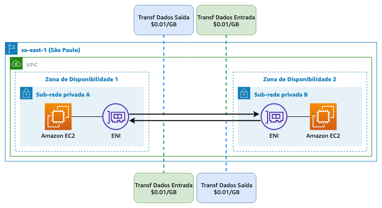 - Instância Amazon EC2 transferindo dados para outra instância na mesma conta, mas em uma Zona de Disponibilidade (AZ) diferente;