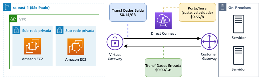 i.Será um custo cobrado por GB/mês dependendo da região e da capacidade da porta. Veja a Definição de preço do AWS Direct Connect para mais detalhes;