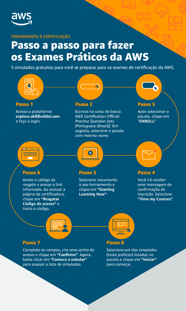 Os exames práticos (também conhecidos como simulados preparatórios) para as provas de certificação da AWS estão disponíveis na plataforma AWS Skill Builder. Por lá, é possível acessar o AWS Certification Official Practice Question Set, um pacote com simulados em idioma local e que podem ser realizados online quando e onde quiser. Para acessar o material, veja o passo a passo abaixo.