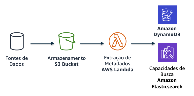 - Usando o AWS Lambdapara capturar metadados de objetos e o Amazon DynamoDB ou o Amazon Elasticsearch Service como armazenamento para criar um catálogo de dados abrangente com recursos pesquisáveis, conforme mostrado na seguinte arquitetura: