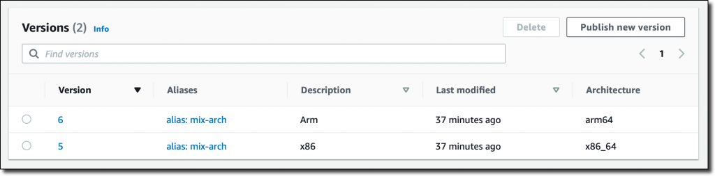Eu uso um alias com um peso de 50% na versão x86 e um peso de 50% na versão ARM para distribuir as invocações uniformemente. Ao invocar a função por meio desse alias, as duas versões executadas nas duas arquiteturas diferentes são executadas com a mesma probabilidade.