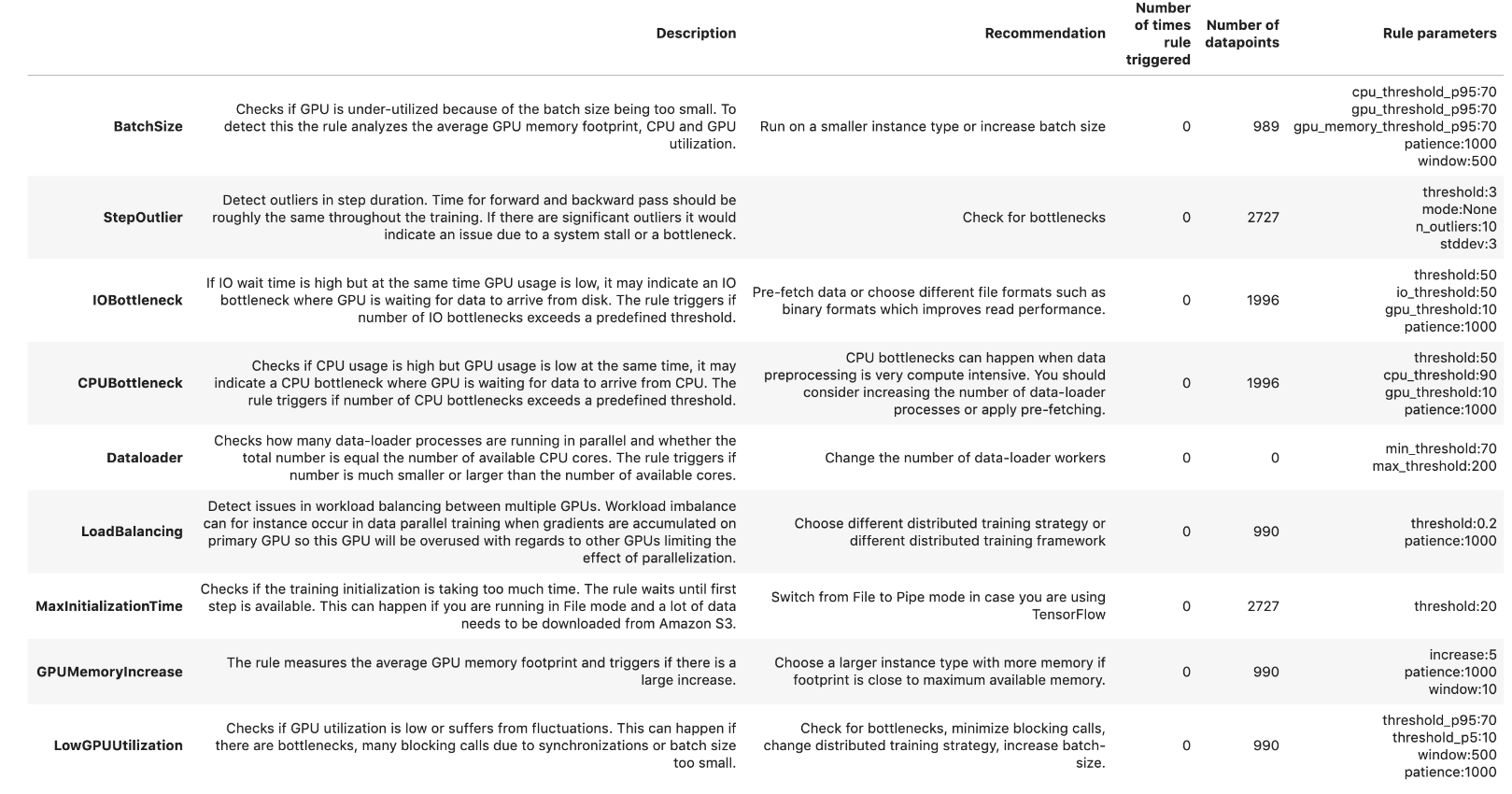 A regra Batchsize ajuda a detectar se a GPU é subutilizada devido ao tamanho do batch ser muito pequeno. Para detectar isso, a regra analisa o uso de memória da GPU e a utilização de CPU e GPU. A regra analisou 1.000 datapoints e foi acionada quatro vezes. Seu trabalho de treinamento está subutilizando a instância. Você pode considerar mudar para um tipo de instância menor ou aumentar o tamanho do batch de treinamento do modelo. Além disso, também é fornecido o momento em que esta regra foi acionada pela última vez.