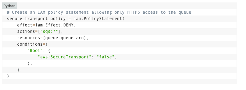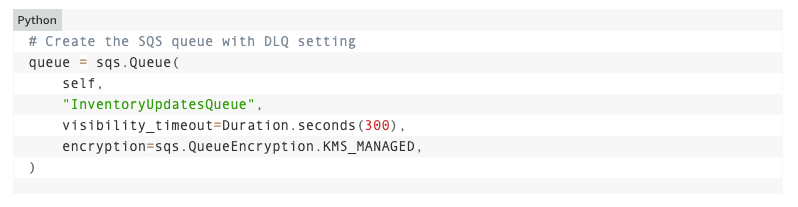 O seguinte código usando o AWS Could Development Kit (AWS CDK) define o SSE-SQS como o tipo de chave de criptografia padrão. No entanto, o código CDK da AWS a seguir mostra como criptografar a fila com o SSE-KMS.
