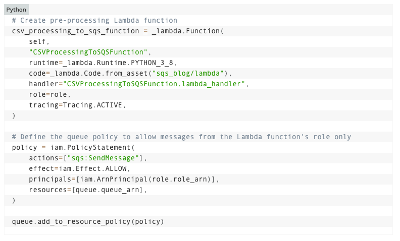 O seguinte trecho de código do AWS CDK mostra como criar uma DLQ para a fila de origem e configura uma política de DLQ para permitir somente mensagens da fila SQS de origem. É recomendável não definir o valor max_receive_count como 1, especialmente ao usar uma função Lambda como consumidor, para evitar o acúmulo de muitas mensagens na DLQ.