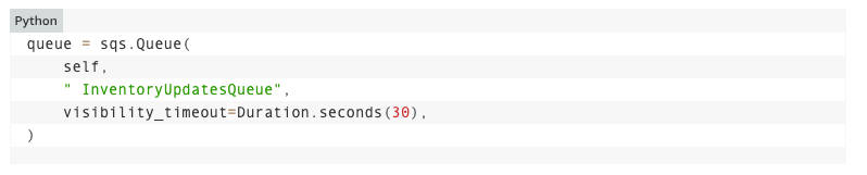 No exemplo de gerenciamento de inventário, definir o tempo limite de visibilidade correto ajuda o aplicativo a falhar rapidamente e a melhorar os tempos de processamento de mensagens. Como a função Lambda normalmente processa mensagens em milissegundos, um tempo limite de visibilidade de 30 segundos é definido no seguinte trecho de código do AWS CDK.