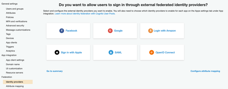 O Amazon Cognito possui dois componentes, sendo que o User Pool é o que faz a autenticação do usuário, com a possibilidade dele se autenticar usando uma base de usuários local ao serviço ou integrações com outros serviços: Facebook, Google, Amazon, Apple, OpenIDConnect e SAML 2.0 através da configuração de Identidade Federada (menu a esquerda embaixo na imagem):