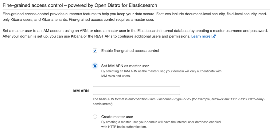 No momento de criar o domínio do Elasticsearch, ao preencher o IAM ARN do usuário mestre de controle de acesso granular (seção da configuração apresentada na figura abaixo), deve ser usado o mesmo Authenticated role do Cognito Identity Pool.
