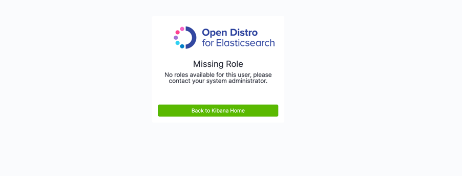 Ao usar controle de aceso granular e autenticação com Cognito, se as configurações de role adequadas não forem feitas, o Kibana exibirá uma página de início de sessão não funcional ou uma página de missing role, dependendo do erro de configuração: