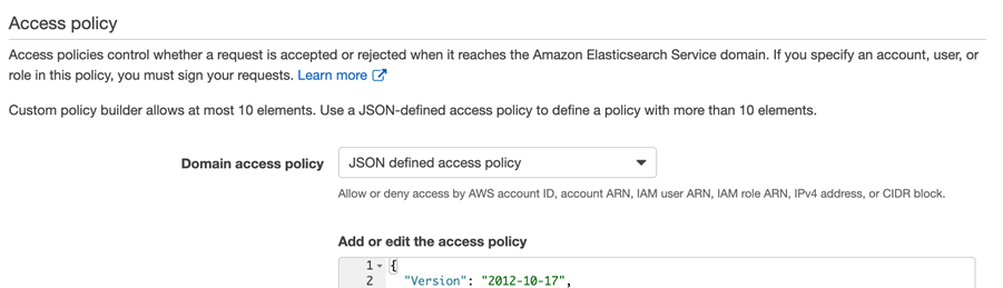 Para maior segurança, na configuração de política de acesso ao domínio do Elasticsearch é sugerido limitar acesso ao ARN do(s) role(s) do Cognito, que ficará conforme abaixo – note que o domínio não está aberto, uma vez que só usuários associados a estes roles podem acessar o domínio:
