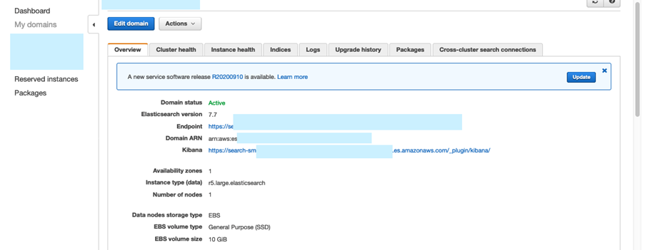 Após a criação do domínio integrado com o Cognito, o master user terá acesso ao Dashboard do Kibana. O link para o Kibana se encontra na tela inicial do domínio Elasticsearch e estará acessível conforme configuração (a parte de acesso – por exemplo via VPC – é explicada na parte 1 deste blogpost).