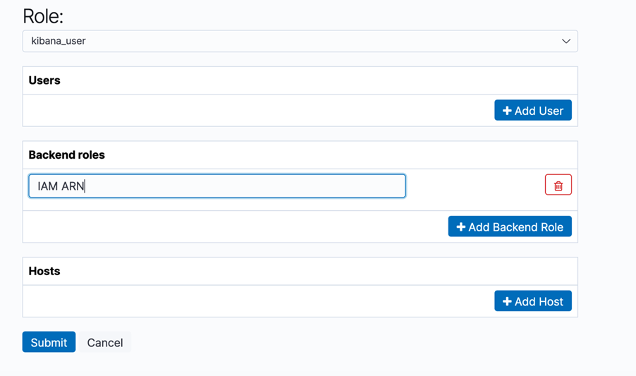 Na seção de Segurança é possível associar roles do Kibana (foto abaixo) a roles da AWS (via IAM ARN do role).