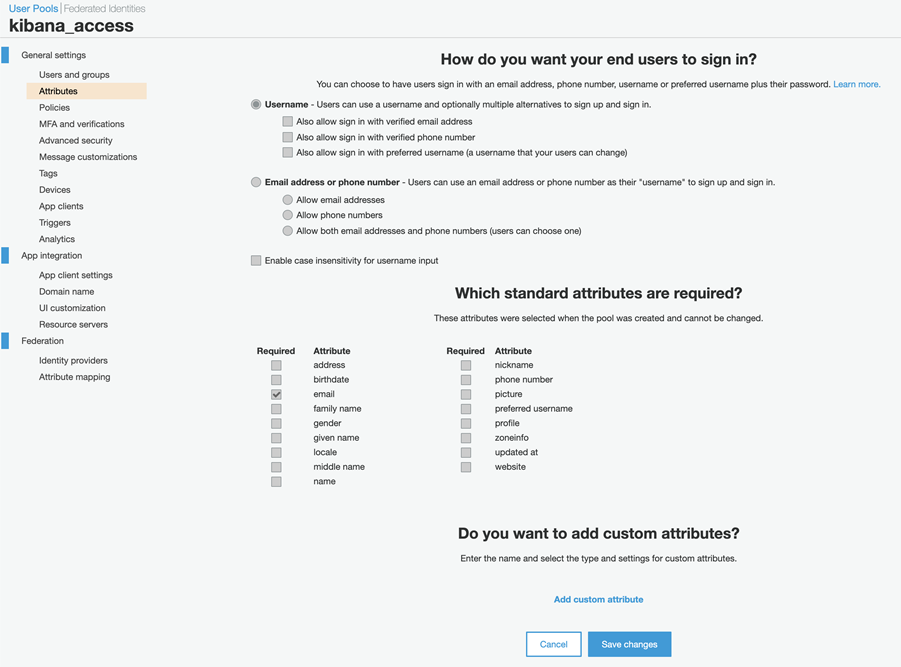 Na configuração padrão do Cognito User Pools, é atribuído um conjunto de atributos a todos os usuários, porém também podem ser adicionados atributos personalizados confome pode ser visto na imagem abaixo.