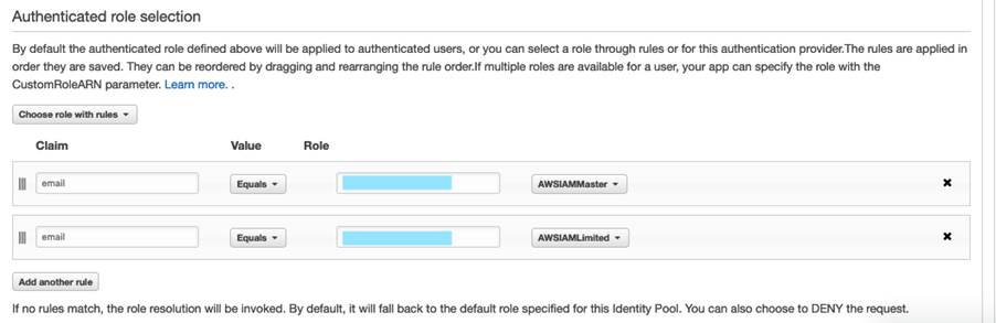No Cognito Identity Pool, configure a seção de Authentication Providers, onde você deve apontar para o Cognito User Pool, pois ele que irá prover a autenticação. Nesta parte é selecionado o Authenticated role, ou seja, aqui é possível associar usuários autenticados a roles específicos de acordo com regras pré-definidas (menu que aparece aberto na imagem abaixo). As regras são aplicadas na ordem em que são salvas. Elas podem ser reordenadas arrastando e reorganizando a ordem da regra. Se vários roles estiverem disponíveis para um usuário, seu aplicativo pode especificar a função com o parâmetro CustomRoleARN.