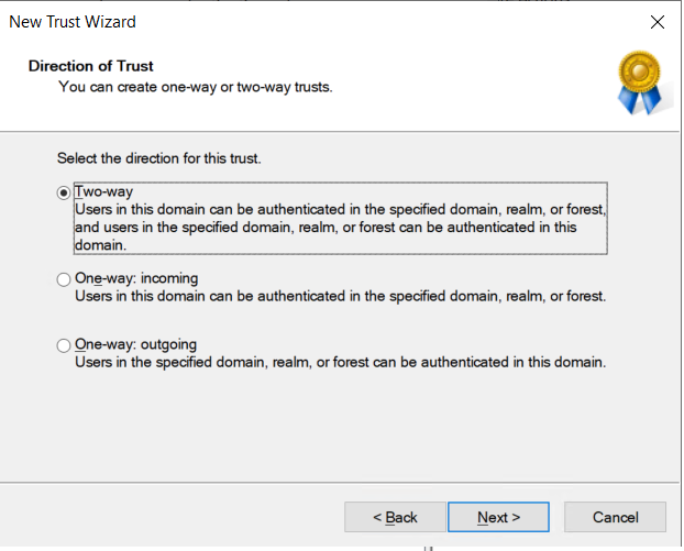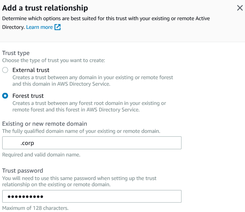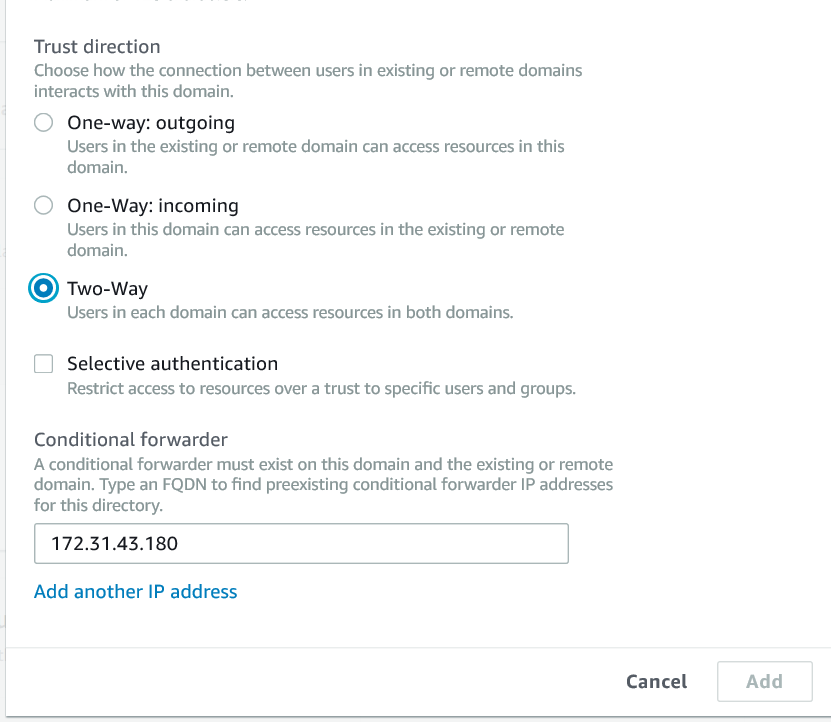 f. Selecionamos a opção “Two-way”, que seria um trust bi-direcional. Isto pode ser ajustado para um trust em que apenas o Active Directory on-premises confia no AWS Managed AD.