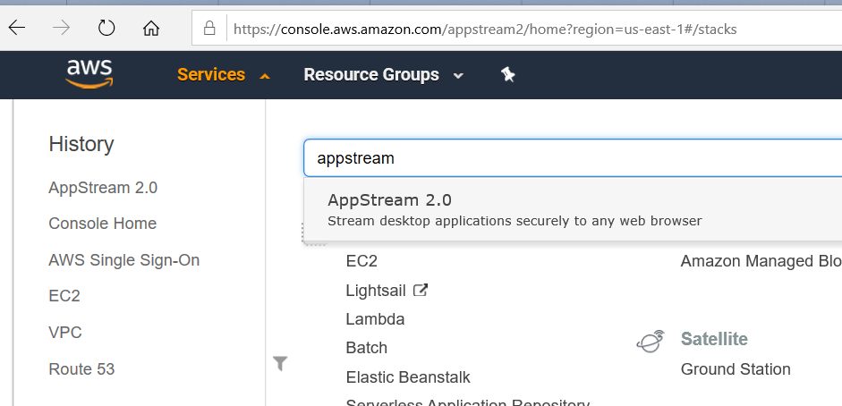 1) Na console AWS, selecionamos o serviço AppStream 2.0.