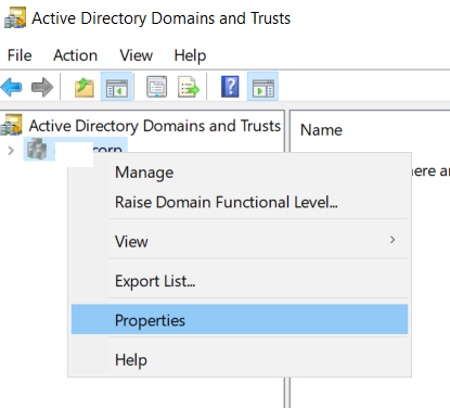a. No Active Directory do ambiente on-premises, executamos o “Active Directory Domains and Trusts” e selecionamos a opção “Properties”.
