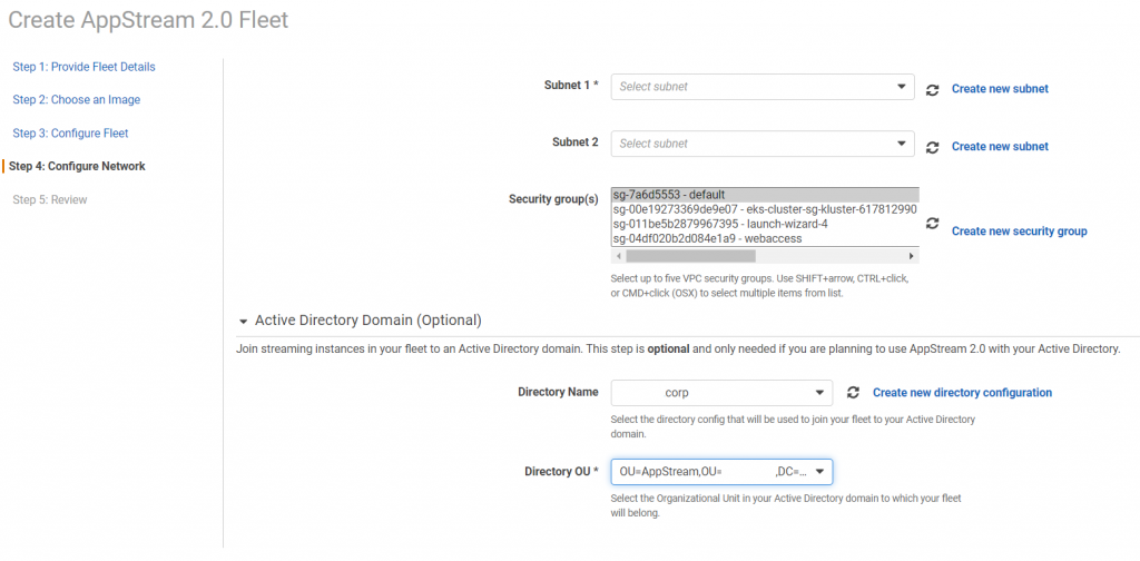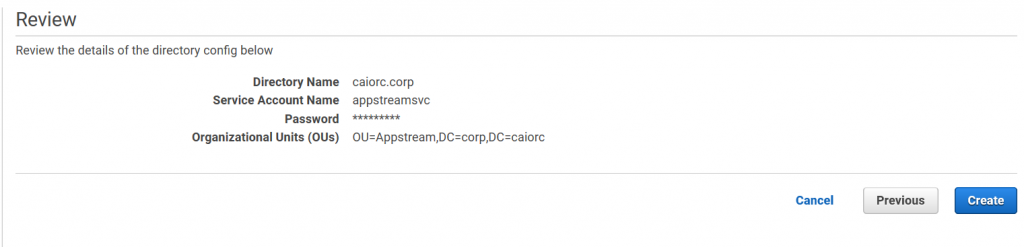 3) Criamos o Directory Config selecionando a estrutura de Organization Unit (OU) que as instâncias de AppStreams 2.0 serão criadas e a conta de serviço com permissões para efetuar a criação (AWS Managed AD).