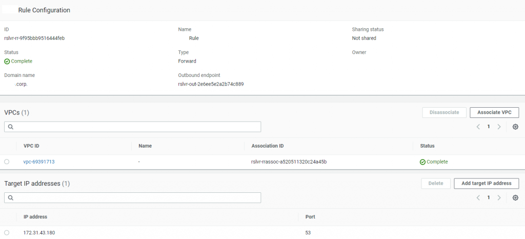 Esta segunda regra irá efetuar o forward de DNS do domínio “forestB.corp” para o Domain Controller deste ambiente, que possui o serviço de DNS [172.31.43.180].