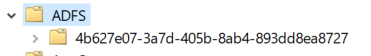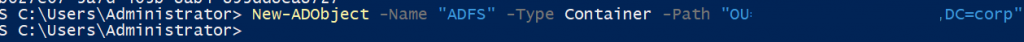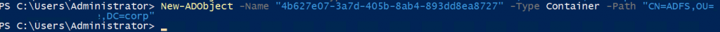 c. Agora iremos criar um contêiner dentro da estrutura de ADFS. Desta vez, iremos utilizar o nome do GUID coletado no passo a) para a criação [New-ADObject -Name “GUID” -Type Container -Path “CN=ADFS,OU=YourNetBIOSName,DC=YourDomainSuffix,DC=YourDomainRoot”].