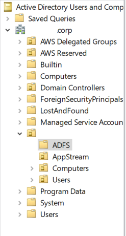 b. Crie um contêiner chamado ADFS na sua OU. A OU está localizada na raiz do domínio e tem o mesmo nome que o nome NetBIOS que você especificou ao criar seu diretório do AWS Microsoft AD [New-ADObject -Name “ADFS” -Type Container -Path “OU=SeuNomeNETBIOS,DC=DomainSuffix,DC=DomainRoot”].