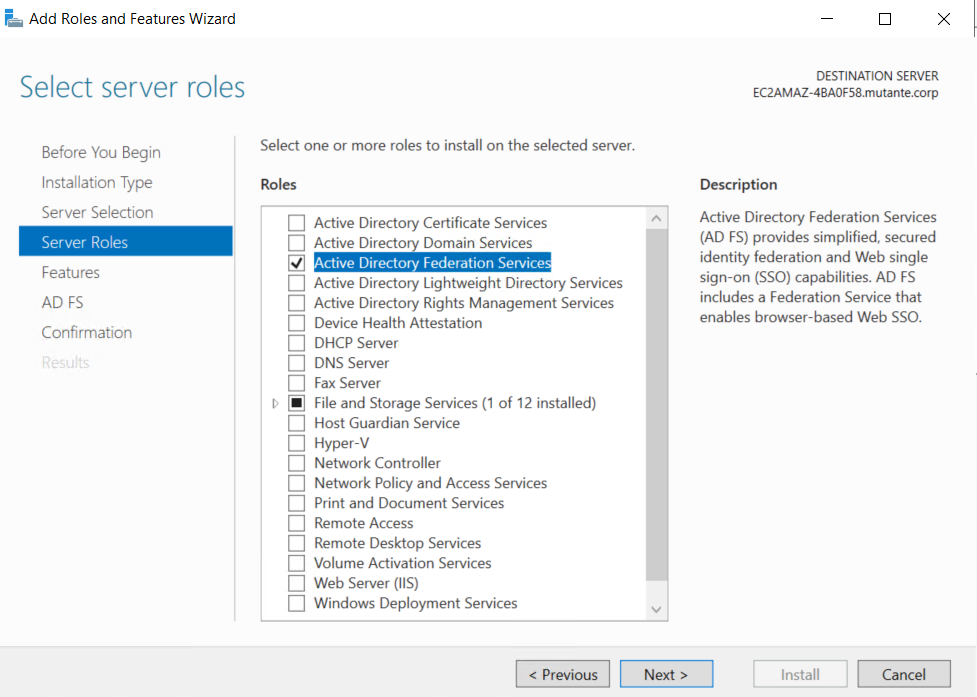 3. No EC2 criado, instale o serviço de Active Directory Federation Services: