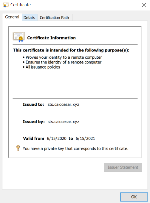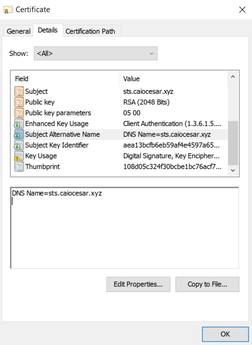 É importante observar que o nome comum e o nome alternativo do assunto (SAN) devem incluir o nome do serviço de federação que você decide usar para o servidor ADFS. No meu exemplo, o nome é sts.caiocesar.xyz. Para esta postagem no blog, não obtivemos um certificado de um provedor de certificados SSL (estamos usando um self-signed para testes).