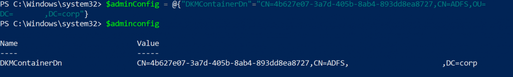 $adminConfig = @{“DKMContainerDn”=”CN=GUID,CN=ADFS,OU=YourNetBIOSName,DC=YourDomainSuffix,DC=YourDomainRoot”}