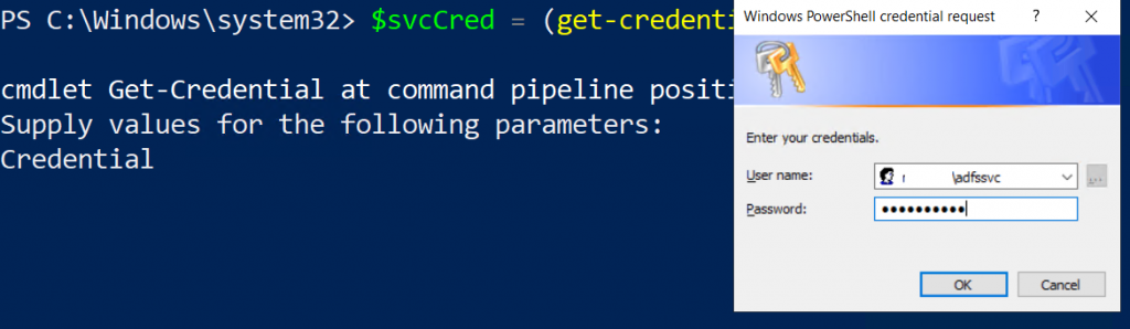 6. Digite as credenciais da conta de usuário padrão do ADFS para o usuário ADFSSVC e salve-a na variável de script, $svcCred, lembrando que em cenários multi-forest esta conta deve ter permissões para ler os atributos do usuário em todos os domínios que contenham usuários autenticados no serviço ADFS.