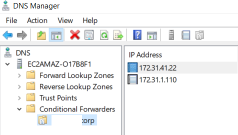 Esta regra irá efetuar o forward de DNS do domínio “dominio.corp” para os Domain Controllers deste ambiente, que possuem os serviços de DNS [172.31.41.22 e 172.31.1.110].