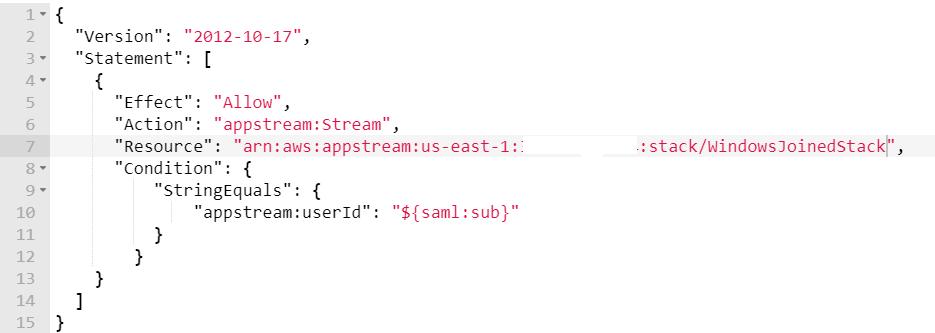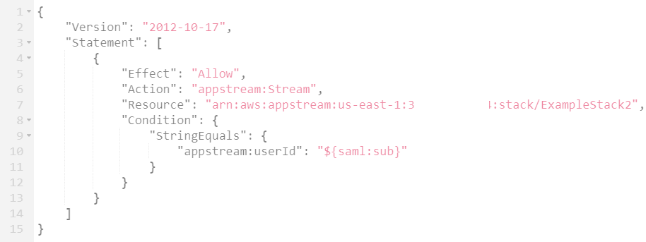 Nesta policy, “Action”: “appstream:Stream”, é a ação que fornece aos usuários do AppStream 2.0 permissões para se conectar a sessões de streaming na stack que criamos. Para o SAML Subject NameId, seria o identificador único do usuário ques está efetuando o login.