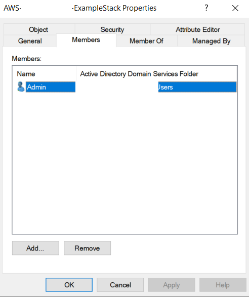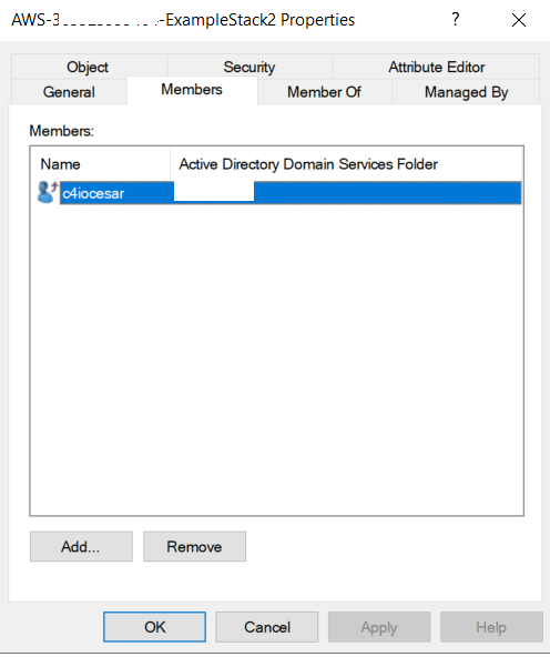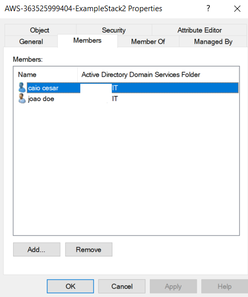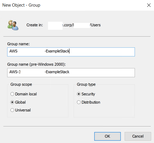 Nota: Para seguir exatamente este passo a passo, nomeie seu grupo do AWS Managed Active Directory no formato “AWS-AccountNumber-ExampleStack”, substituindo AccountNumber pelo seu AWS AccountID (sem hífens). Por exemplo: