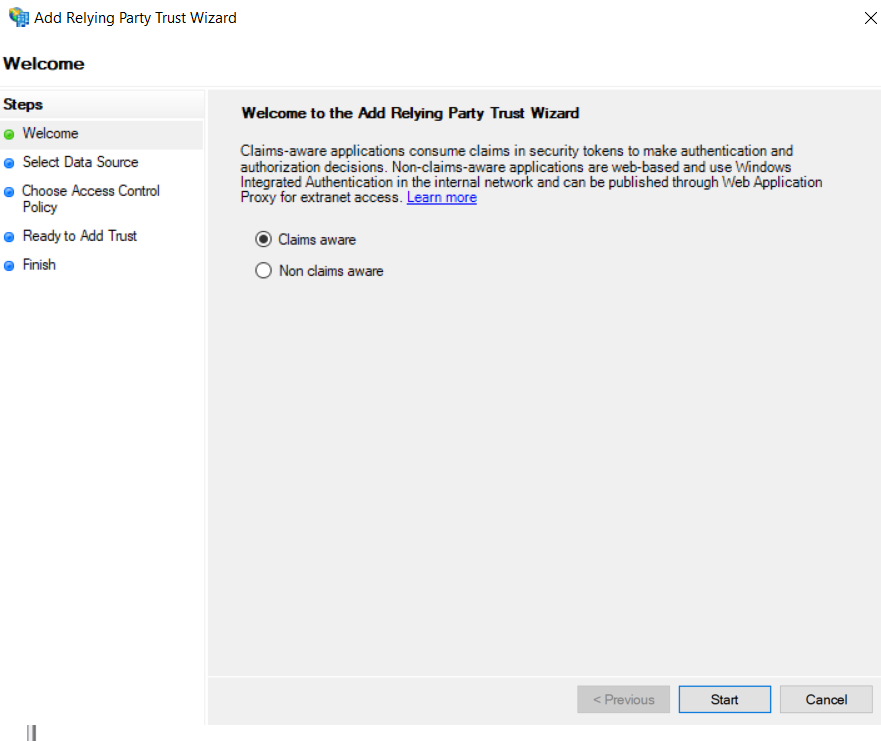 c. Selecione a opção “Claims Aware” e então “Start”.