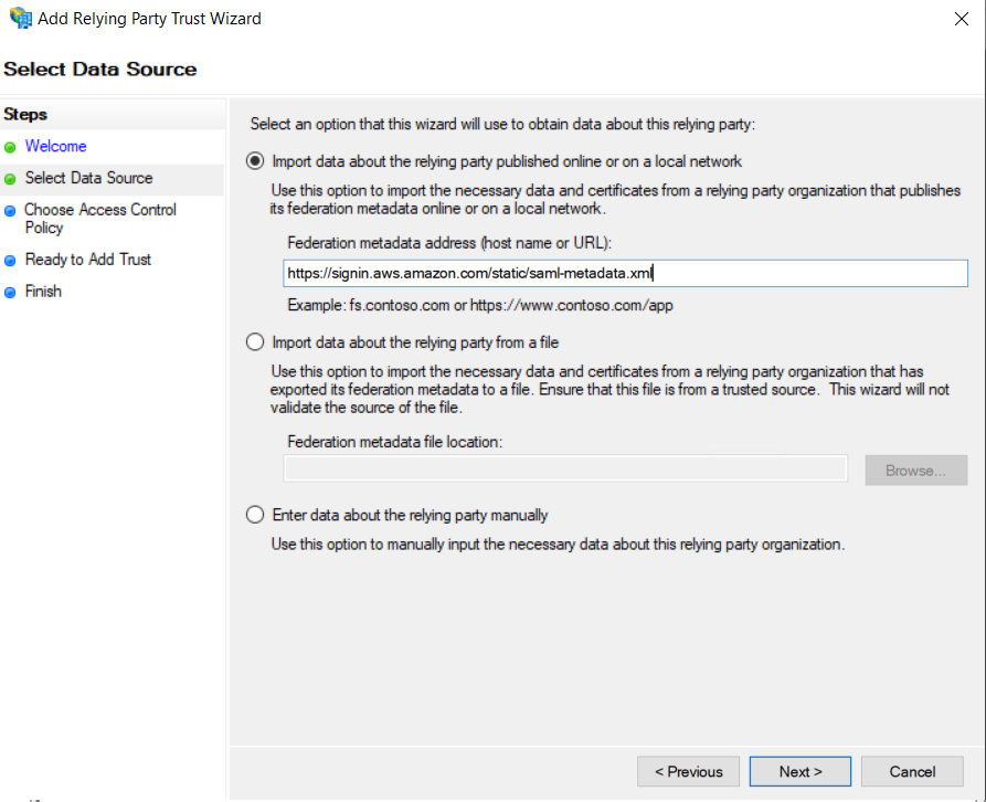 5. Agora, iremos criar a relação de confiança entre o ADFS e a AWS.