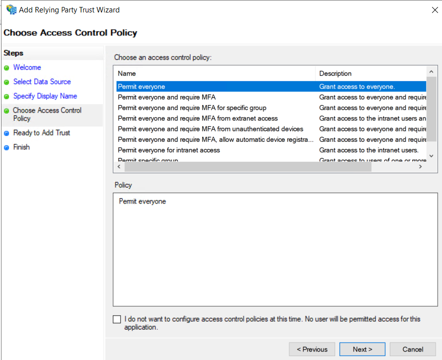 f. Selecione a opção de Access Control Policy. Caso tenha um RADIUS para MFA, esta opção pode ser alterada.