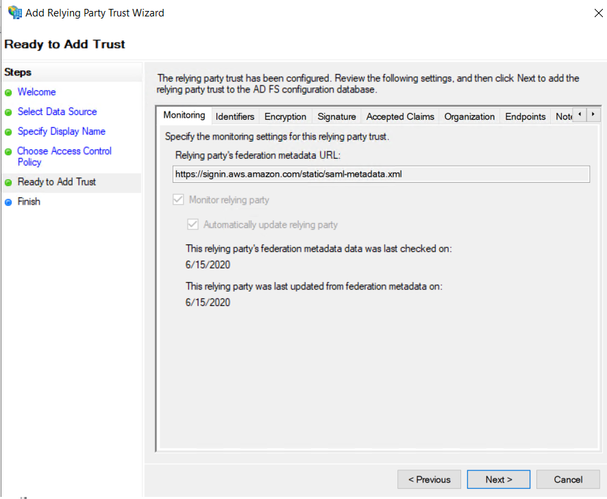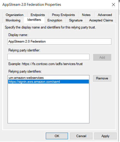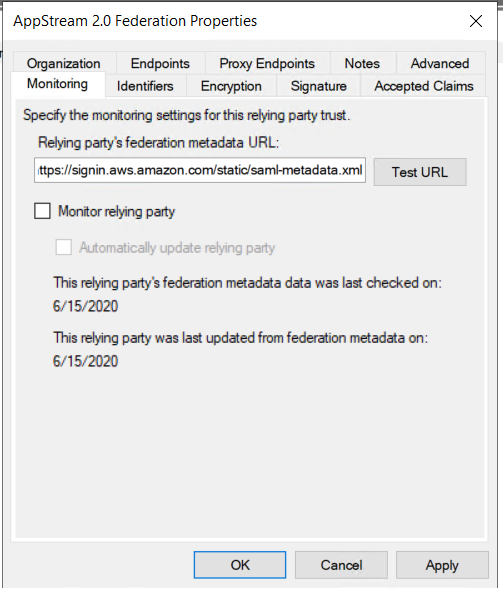 h. Agora, iremos abrir as propriedades do Relying Party Trust , remover a opção “Monitor Relying Party” na tab de “Monitor” e adicionar a URL https://signin.aws.amazon.com/saml para o “Relying Party Identifier” para que o Relying Party não seja atualizado automaticamente.