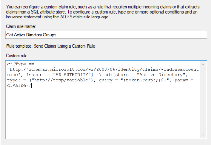 Custom Rule: c:[Type == “http://schemas.microsoft.com/ws/2008/06/identity/claims/windowsaccountname”, Issuer == “AD AUTHORITY”] => add(store = “Active Directory”, types = (“http://temp/variable”), query = “;tokenGroups;{0}”, param = c.Value);