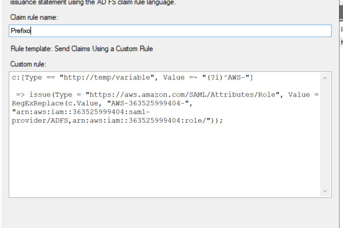 Essa regra converte o valor do grupo do Active Directory começando com o prefixo “AWS-AccountNumber” nas funções conhecidas pela AWS. Para esta regra, precisamos do AWS IdP ARN que anotamos anteriormente.