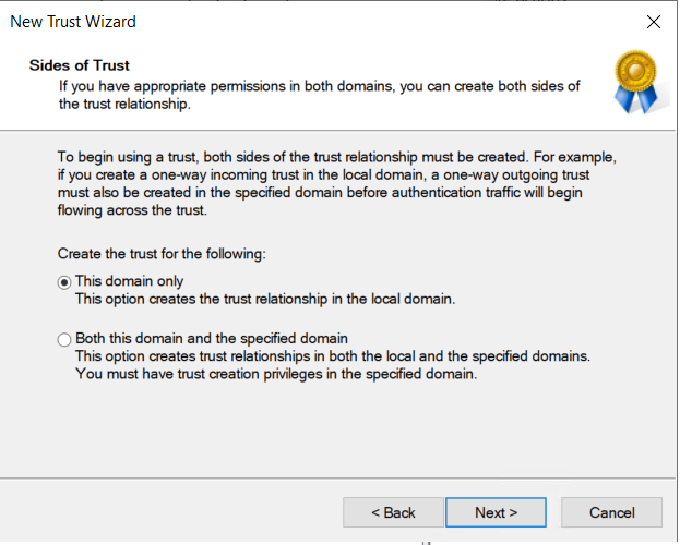 g. Selecionamos a opção para apenas o domínio selecionado com o escopo de autenticação “Forest-wide authentication”.