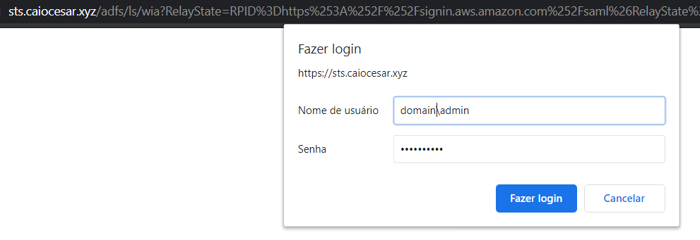 1. O usuário navega para a URL da aplicação publicada no ADFS. A página de logon solicita autenticação para o usuário. Vale lembrar que a estação de trabalho pode estar efetuando o acesso de qualquer localização via internet e o computador em questão não precisa ser domain joined.