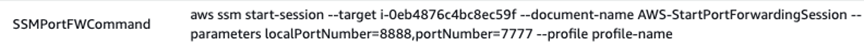 Acesse a console do CloudFormation e lá encontre o comando para realizar o redirecionamento de porta. O comando é uma saída gerada pelo CloudFormation stack com o nome de chave “SSMPortFWCommand”: