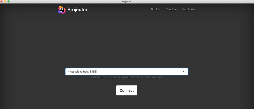 Use o cliente nativo, também conhecido como “Projector Launcher” ou um Web Browser para acessar a configuração IDE IntelliJ remota usando o endereço https://localhost:8888 .