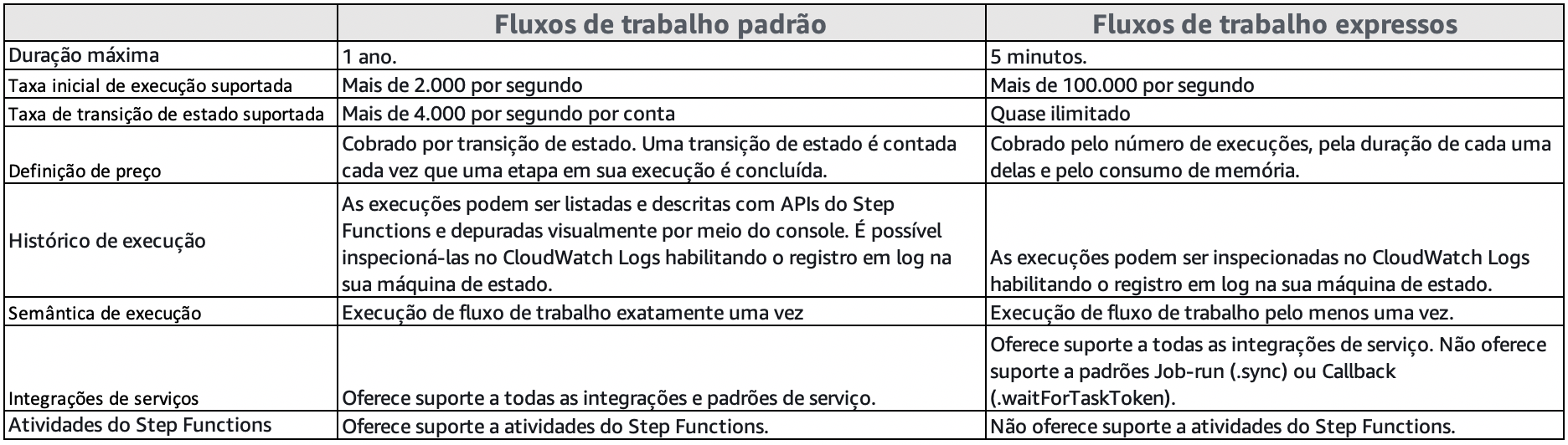 Os fluxos de trabalho expressos são ideais para cargas de trabalho de processamento de eventos de alto volume, como ingestão de dados IoT, processamento e transformação de dados de streaming e back-ends de aplicativos móveis. Eles podem ter uma duração máxima (tempo de execução) de até cinco minutos. No entanto, os fluxos de trabalho expressos empregam um modelo de execução chamado “pelo menos uma vez”, em que existe a possibilidade de uma execução ser efetuada mais de uma vez.