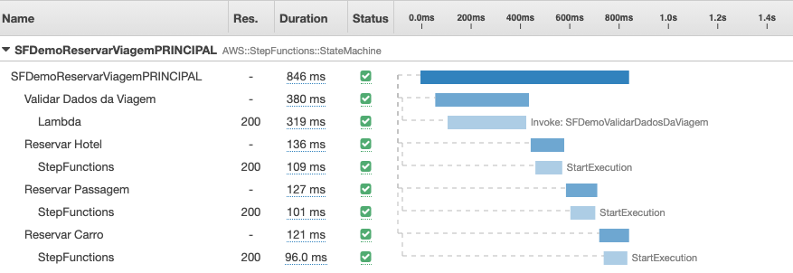 Nesta execução, o fluxo principal teve a duração de 846 ms, que é a agregação do tempo de sua execução e também dos outros fluxos de negócio. A execução da função Lambda de validação dos dados de viagem durou 380 ms, a execução do fluxo de negócio reservar hotel durou 136 ms e assim por diante.